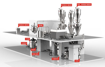 1.整套系統(tǒng)可以實現(xiàn)包含粉體的輸送、自動開包、粉體投料、負壓/正壓粉體輸送、粉體、液體的自動計量、打膠機、攪拌機、脫泡機、中轉(zhuǎn)罐、槳料的過程控制和輸送以及以上所有設(shè)備的自動化系統(tǒng)的實現(xiàn)。